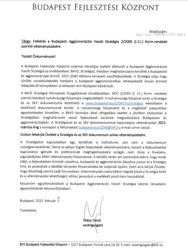 A Stratégia most megkezdődő társadalmi egyeztetése megelőzi a Kormány döntését, így a dokumentum elfogadása előtt a beérkező vélemények beépítésére még van lehetőség, a Stratégia szövegéhez tett észrevételeket és javaslatokat a budapestvasut2040@bfk.hu e-mail címre várja a Budapest Fejlesztési Központ 2021. március 6-ig.