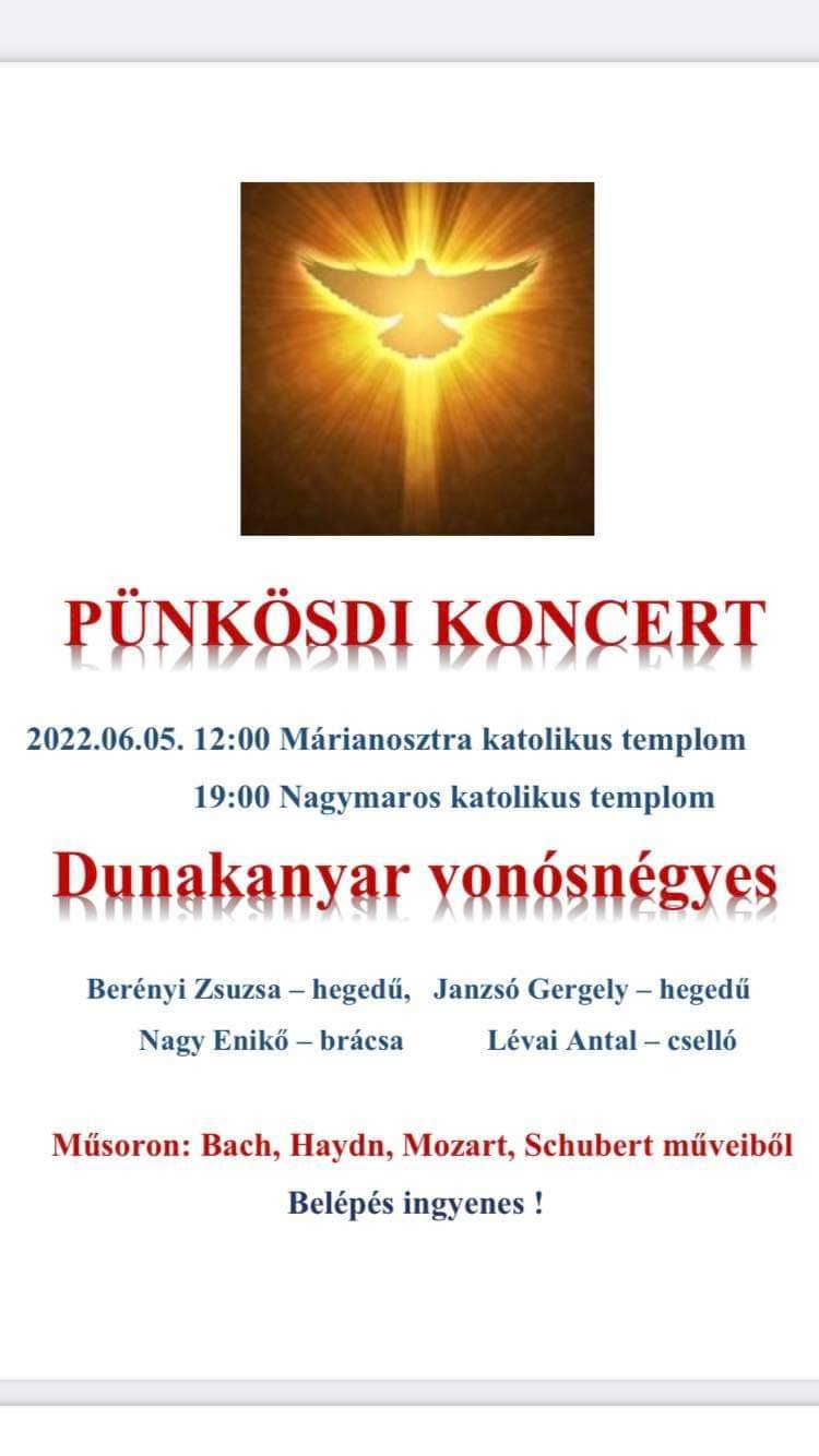 Közeleg Pünkösd, a Szentlélek kiáradásának ünnepe. Június 5-én, Pünkösd vasárnapján 19 órakor lélekemelő élményben lehet részünk, hiszen a Dunakanyar Vonósnégyes a nagymarosi katolikus templomban ad koncertet, ahol felcsendülnek majd Bach, Haydn, Mozart és Schubert művei.
