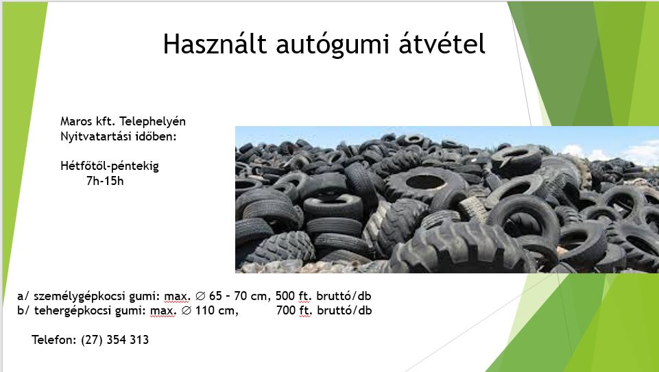 Felhívjuk a figyelmet, hogy tárolóhely hiánya, a szállítási távolság és annak költsége miatt kizárólag nagymarosi lakosok és legfeljebb 4 darab gumiabroncsot adhatnak le!