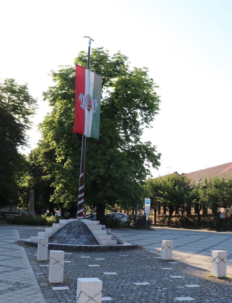 A mi országzászlónkat Edöcsény András, akkori polgármester álmodta meg és vették be a Fő tér felújításának projektjébe. Varga Csaba főépítész tervezte meg, az idézetet is ő javasolta, Murányi Zoltán is sokat tett a megvalósulásért. Sajnos 2006-ban az árvíz és a választások is közbeszóltak, így az átadásra csak 2006 őszén kerülhetett sor. A zászlóárbóc tetején lévő turul Seregi György iparművész ajándéka. Különlegessége az országzászlónak, hogy az előterében az elszakított országrészek városait feltüntető kőlapokat helyeztek el. Köszönet a létrehozásában szerepet vállalóknak.