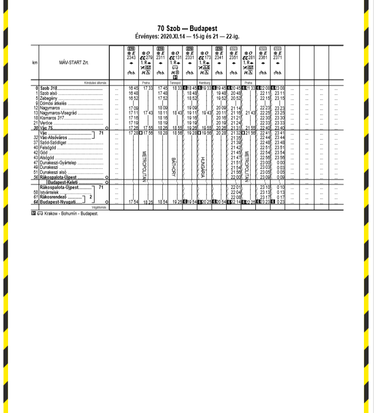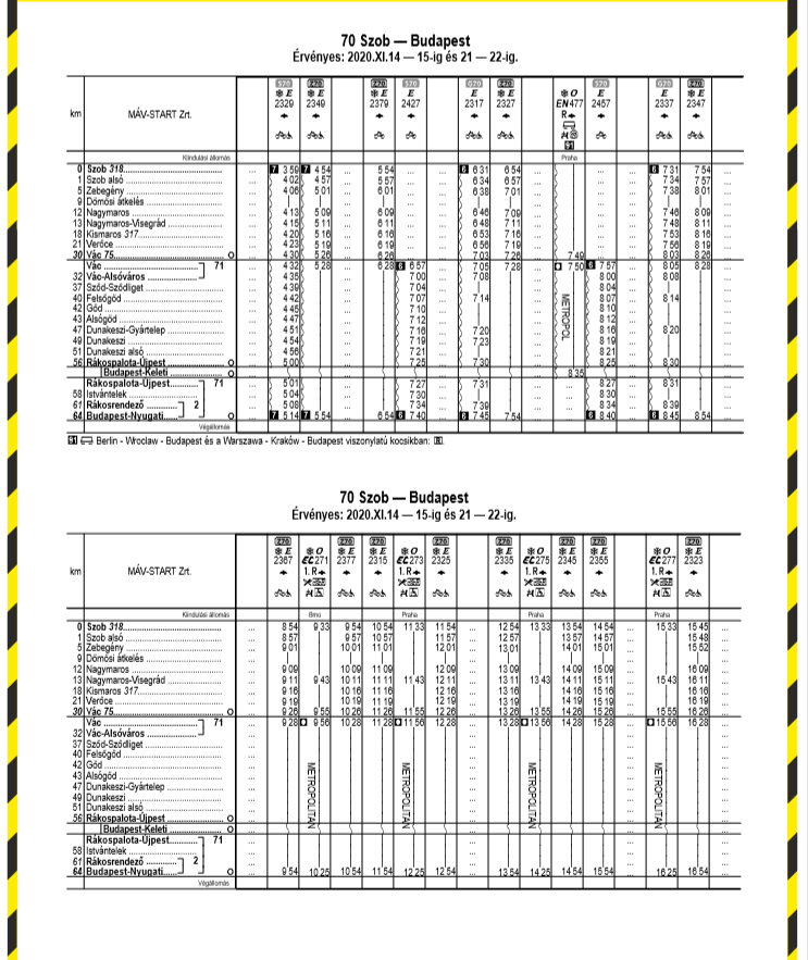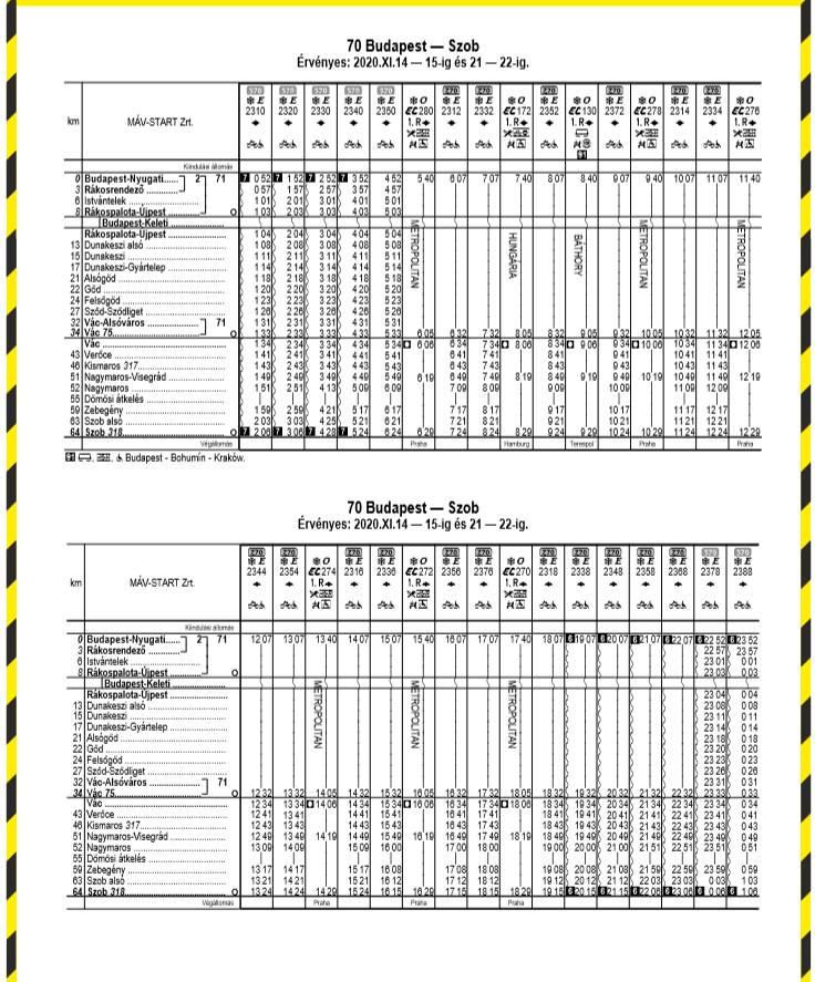 A MÁV-START Zrt. tájékoztatása szerint 2020. november 14-én, 15-én és 21-én, 22-én Nagymaros – Szob állomások között végzett pályakarbantartási munkák miatt a 70. sz. Budapest – Szob vasútvonalon a mellékletben szereplő vonatok módosított menetrend szerint közlekednek.