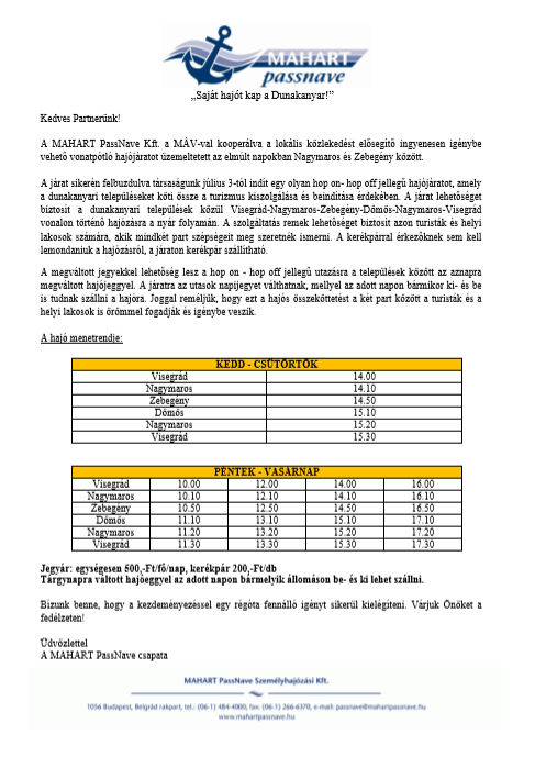 A vonatpótló járat sikerén felbuzdulva a MAHART PassNave Kft. július 3-tól elindít egy olyan hop on- hop off jellegű hajójáratot, amely a dunakanyari településeket köti össze a turizmus kiszolgálása és beindítása érdekében.